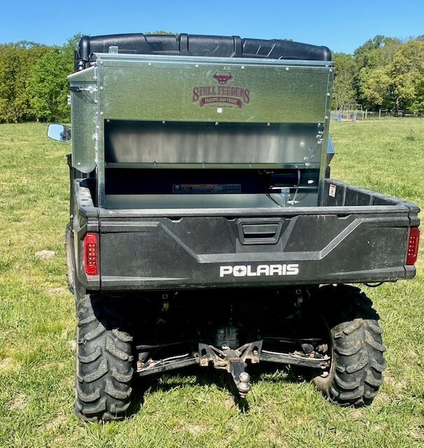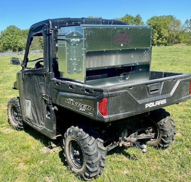 This feeder sits down inside the bed of a UTV. It is made of 16 GA Galvanized Steel and has a 4 inch chain driven auger. There is a rope to control the chute up and down from the cab without getting out. It has a 12 volt motor with an "on demand" style switch for easy control from your seat that works off of a Deep Cycle auxiliary battery (NOT INCLUDED) (DO NOT ATTACH TO YOUR UTV BATTERY UNTIL YOU TALK TO YOUR UTV MECHANIC. MOTOR DRAWS 30 AMPS) The auger cover inside of the feeder adjusts for different Grain or Cube types. This feeder has a capacity of holding up to 300 pounds of whole corn. It is a great feeder to feed all types of livestock including bait piles for wildlife. This unit is made to bolt to bottom of UTV bed. If mounted on load cells for a scale you must use extra metal between load cell and bottom ends of feeder for reinforcement. We offer a bracket for this. Feeder Dimensions 21D x 43W x 36T. EMPTY FEEDER WEIGHT IS 185 LBS.