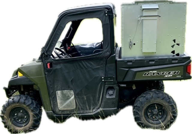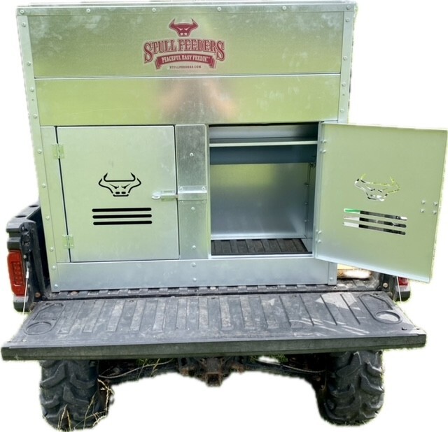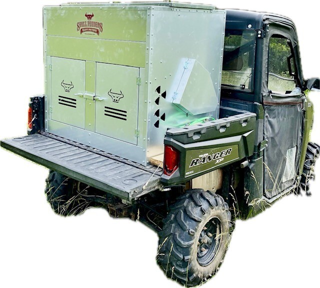 This Dog Box feeder has 2 compartments that are 21"W x21"D and sits down inside the bed of a UTV. It is designed with the idea of being able to carry your dogs with you while you are feeding. Also, commonly used for Coon Hunters so you can feed during the day and have a dog box for hunting at night. There are lots of other uses though including for storage. It is made of 16 GA Galvanized Steel and has a 4 inch Chain Driven auger. There is a rope to control the chute up and down from the cab without getting out. It has a 12 volt motor with an "on demand" style switch for easy control from your seat that works off of a Deep Cycle auxiliary battery (NOT INCLUDED) (DO NOT ATTACH TO YOUR UTV BATTERY UNTIL YOU TALK TO YOUR UTV MECHANIC. MOTOR DRAWS 30 AMPS) The auger cover inside of the feeder adjusts for different Grain or Cube types. This feeder has a capacity of holding up to 650 pounds of whole corn. It is a great feeder to feed all types of livestock including bait piles for wildlife. This unit is made to bolt to bottom of UTV bed. If mounted on load cells for a scale you must use extra metal between load cell and bottom ends of feeder for reinforcement. We offer a bracket for this. Feeder Dimensions 33D x 43W x 41T. EMPTY FEEDER WEIGHT IS 275 lbs.