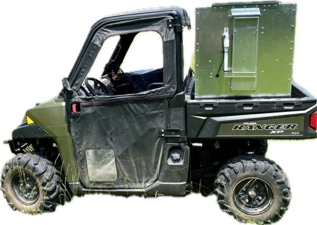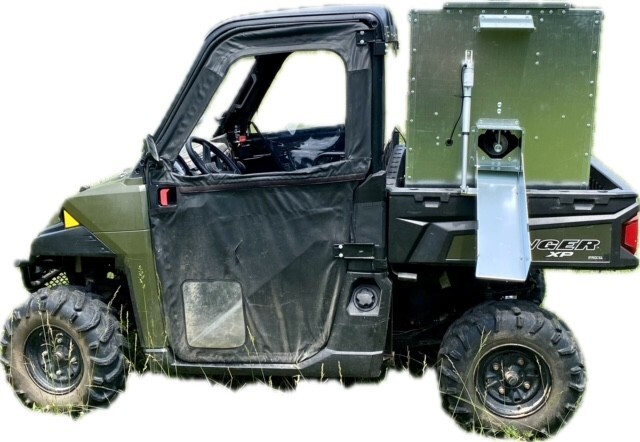 This feeder sits down inside the bed of a UTV. It is made of 16 GA Galvanized Steel and has a 4 inch chain driven auger. There is an actuator to control the chute up and down from the cab without getting out. It has a 12 volt motor with a 20ft "on demand" style switch with toggles to control Actuator and Motor from your seat that works off of a Deep Cycle auxiliary battery (NOT INCLUDED) (DO NOT ATTACH TO YOUR UTV BATTERY UNTIL YOU TALK TO YOUR UTV MECHANIC. MOTOR DRAWS 30 AMPS) The auger cover inside of the feeder adjusts for different Grain or Cube types. This feeder has a capacity of holding up to 600 pounds of whole corn. It is a great feeder to feed all types of livestock including bait piles for wildlife. This unit is made to bolt to bottom of UTV bed. If mounted on load cells for a scale you must use extra metal between load cell and bottom ends of feeder for reinforcement. We offer a bracket for this. Feeder Dimensions 30D x 43W x 41T. EMPTY FEEDER WEIGHT IS 225 LBS.