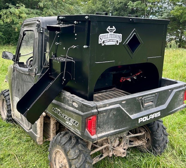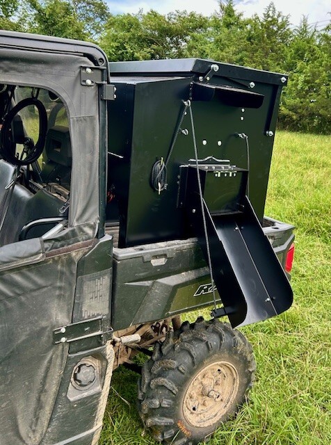 Our 700 lb UTV Feeder has a 6" Chain Driven Auger that turns a slow 60 RPM to help prevent crushing of Cake/Cubes. It is powered by a 12 volt High Torque motor that draws 45 amps with a Resettable Circuit Breaker. It has an on demand style switch that has a 20' long cord for easy control from your seat and also a 4' Bonded Power Cable for attaching to a 27M or 31M Marine Deep Cycle Auxiliary Battery. It is made of mostly 10ga steel that is Welded and Powder Coated Black with an easy open from the ground lid that is the full width of feeder. The Auger Cover inside of the feeder adjusts for the different Grain/Cube types. It has a 6 inch sight tube for rear visibility. This feeder is backed by a 1-year warranty. Must be greased every 50 hours of use for optimum performance. The dimensions are 44" wide X 31" deep X 43" tall and weighs 500 lbs empty.