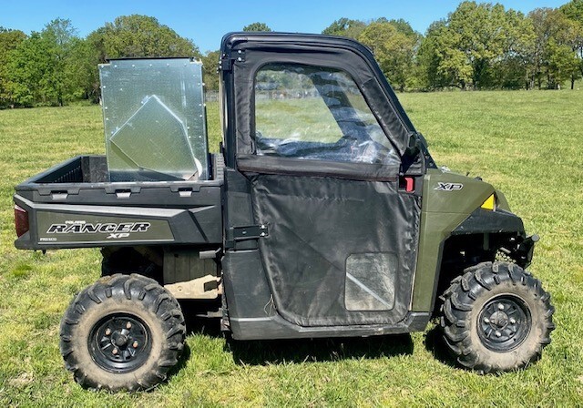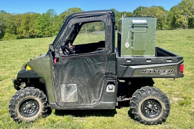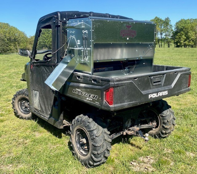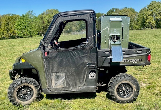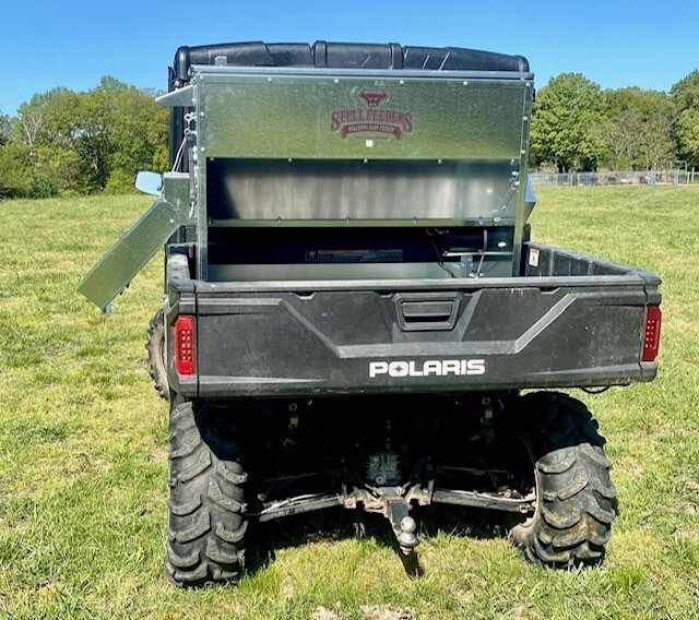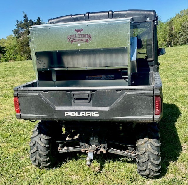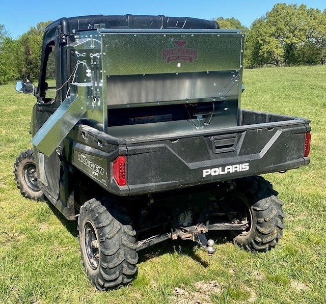 This feeder sits down inside the bed of a UTV. It is made of 16 GA Galvanized Steel and has a 4 inch chain driven auger. There is a rope to control the chute up and down from the cab without getting out. It has a 12 volt motor with an "on demand" style switch for easy control from your seat that works off of a Deep Cycle auxiliary battery (NOT INCLUDED) (DO NOT ATTACH TO YOUR UTV BATTERY UNTIL YOU TALK TO YOUR UTV MECHANIC. MOTOR DRAWS 30 AMPS) The auger cover inside of the feeder adjusts for different Grain or Cube types. This feeder has a capacity of holding up to 300 pounds of whole corn. It is a great feeder to feed all types of livestock including bait piles for wildlife. This unit is made to bolt to bottom of UTV bed. If mounted on load cells for a scale you must use extra metal between load cell and bottom ends of feeder for reinforcement. We offer a bracket for this. Feeder Dimensions 21D x 43W x 36T. EMPTY FEEDER WEIGHT IS 185 LBS.