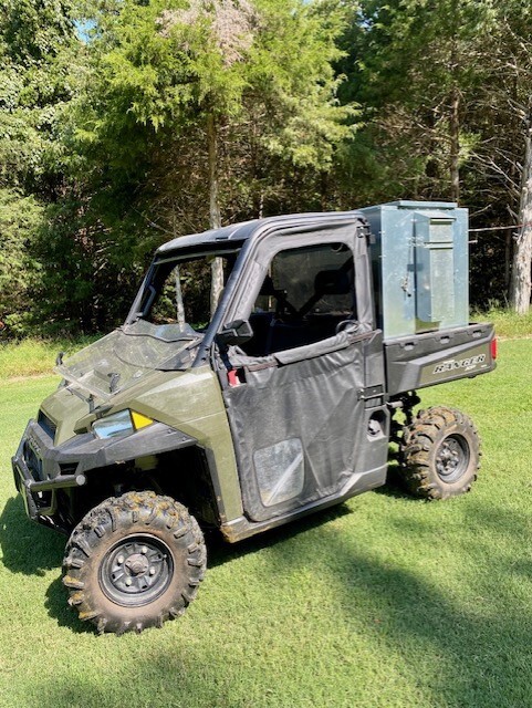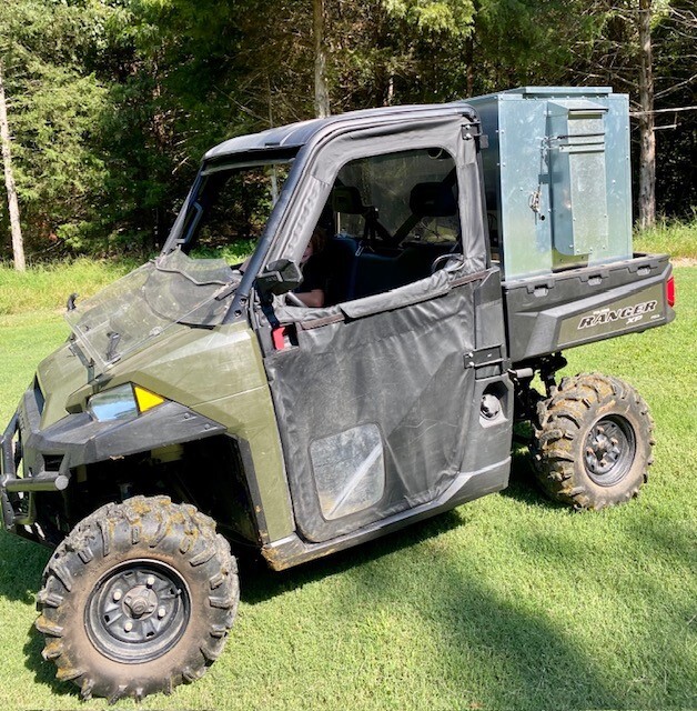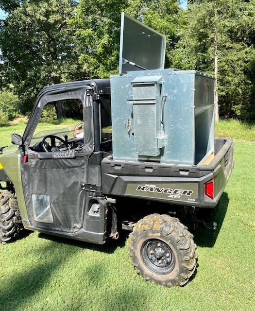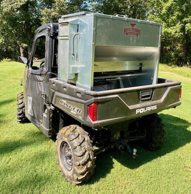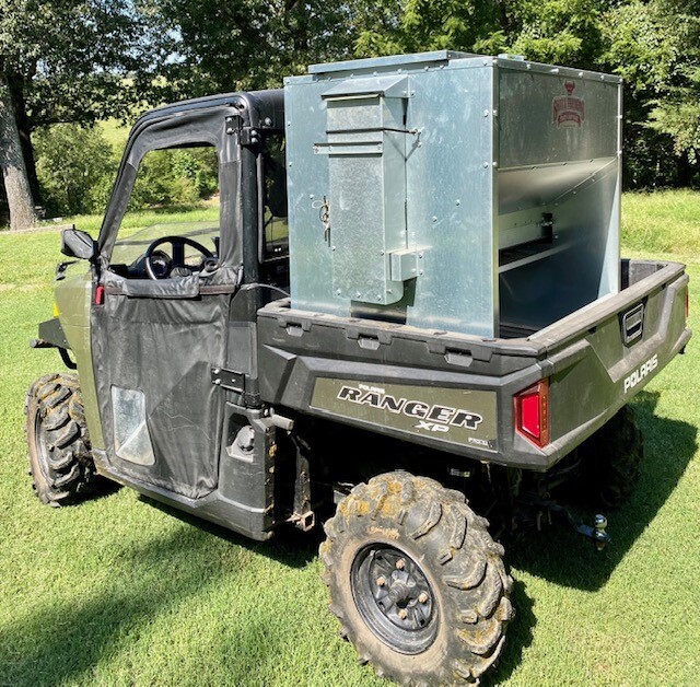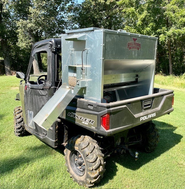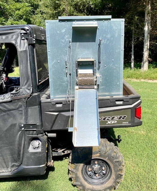 This feeder sits down inside the bed of a UTV. The box of this feeder is 16 GA galvanized steel with a 12 GA galvanized steel conveyor frame. It has a 6 inch wide conveyor belt to deliver almost any type of feed. There is a rope to control the chute up and down from the cab without getting out. It has a 12 volt motor with an "on demand" style switch for easy control from your seat that works off of a Deep Cycle auxiliary battery (NOT INCLUDED) (DO NOT ATTACH TO YOUR UTV BATTERY UNTIL YOU TALK TO YOUR UTV MECHANIC. MOTOR DRAWS 50 AMPS) There is NO cover inside hopper over belt to disturb the flow of feed. This feeder has a capacity of holding up to 600 pounds of whole corn. It is a great feeder to feed all types of livestock including bait piles for wildlife. This unit is designed for bolting to the bottom of UTV bed. If mounted on load cells for a scale you must use extra metal between load cell and bottom ends of feeder for reinforcement. We offer a bracket for this. **NOTE: SOME UTV MODELS MAY REQUIRE BOLTING TO PLYWOOD OR 2X4 TO HELP CHUTE DROP OVER SIDE PROPERLY** Feeder Dimensions 30D x 44W x 39T. EMPTY FEEDER WEIGHT IS 290 LBS.
