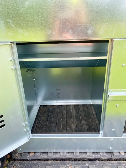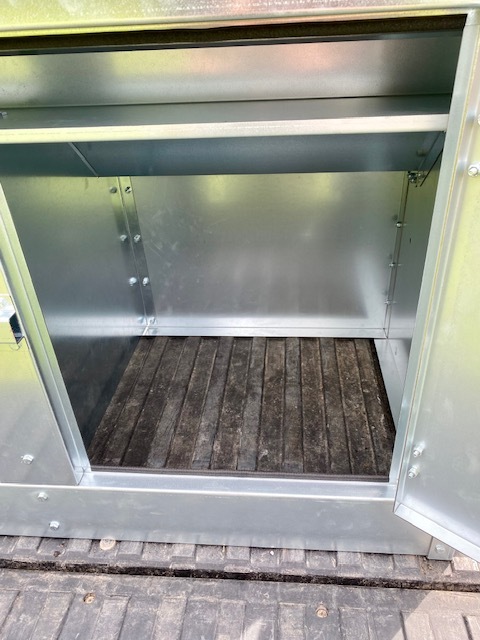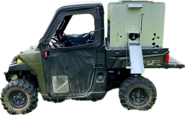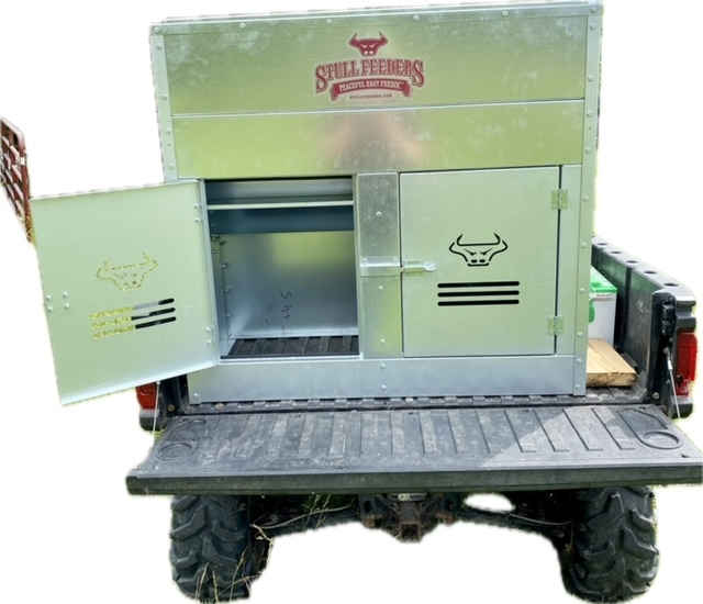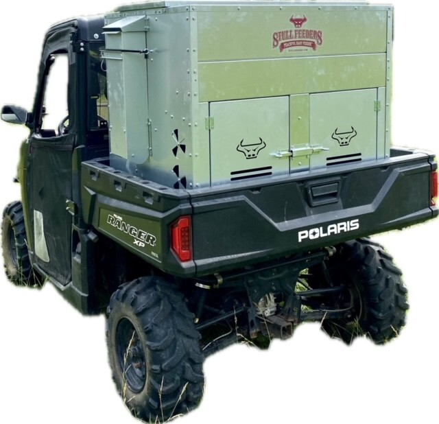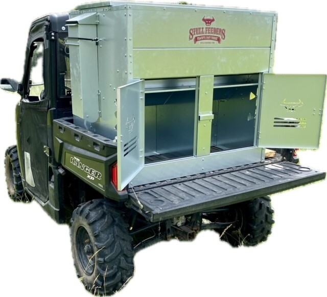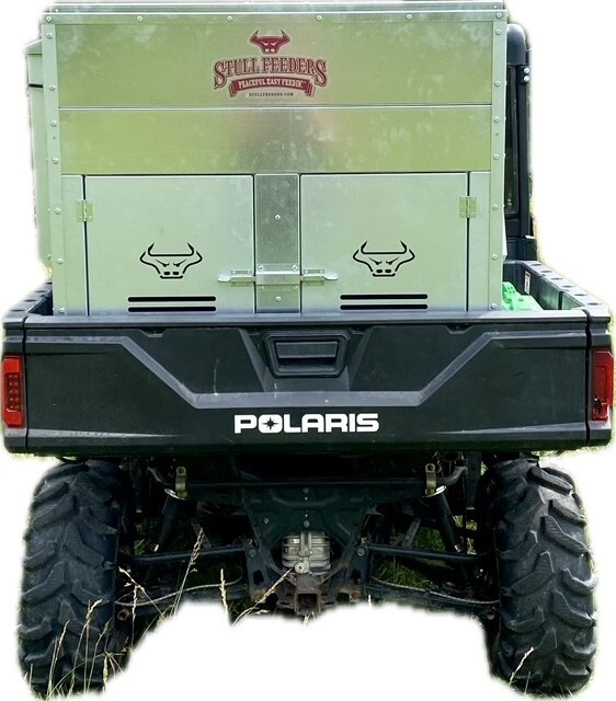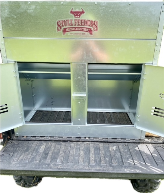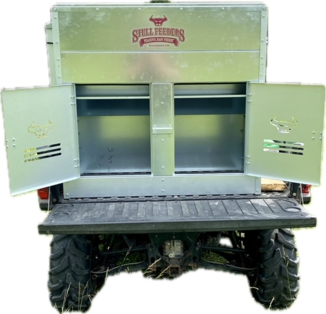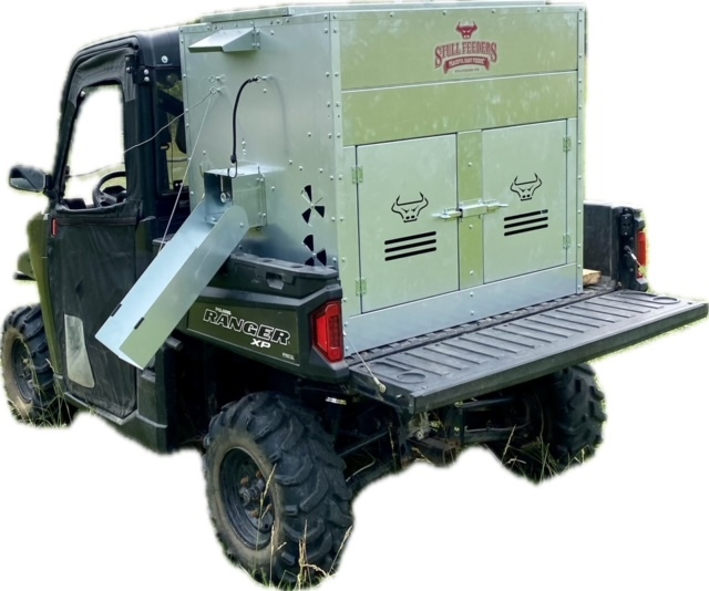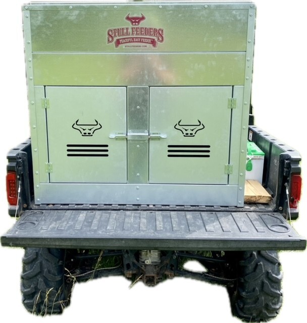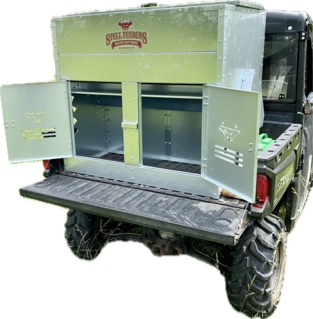 This Dog Box feeder has 2 compartments that are 21"W x21"D and sits down inside the bed of a UTV. It is designed with the idea of being able to carry your dogs with you while you are feeding. Also, commonly used for Coon Hunters so you can feed during the day and have a dog box for hunting at night. There are lots of other uses though including for storage. It is made of 16 GA Galvanized Steel and has a 4 inch Chain Driven auger. There is a rope to control the chute up and down from the cab without getting out. It has a 12 volt motor with an "on demand" style switch for easy control from your seat that works off of a Deep Cycle auxiliary battery (NOT INCLUDED) (DO NOT ATTACH TO YOUR UTV BATTERY UNTIL YOU TALK TO YOUR UTV MECHANIC. MOTOR DRAWS 30 AMPS) The auger cover inside of the feeder adjusts for different Grain or Cube types. This feeder has a capacity of holding up to 650 pounds of whole corn. It is a great feeder to feed all types of livestock including bait piles for wildlife. This unit is made to bolt to bottom of UTV bed. If mounted on load cells for a scale you must use extra metal between load cell and bottom ends of feeder for reinforcement. We offer a bracket for this. Feeder Dimensions 33D x 43W x 41T. EMPTY FEEDER WEIGHT IS 275 lbs.