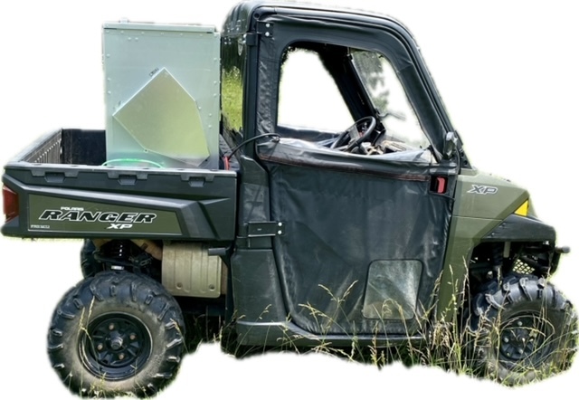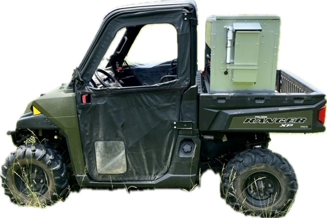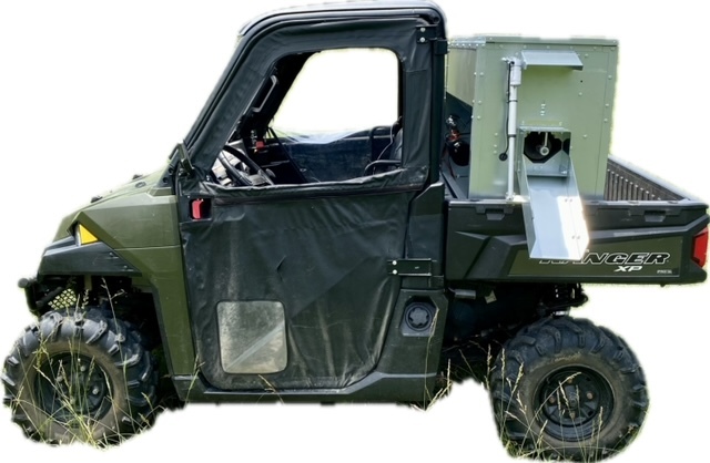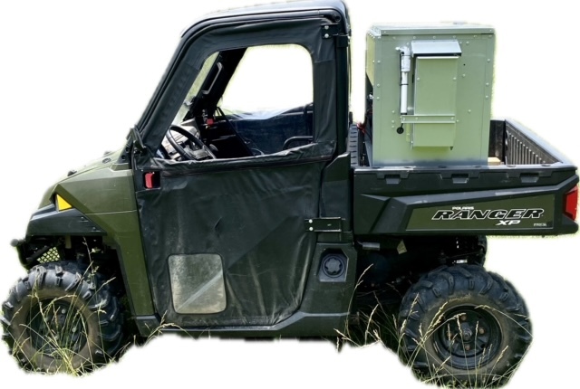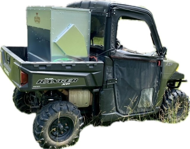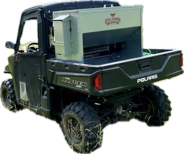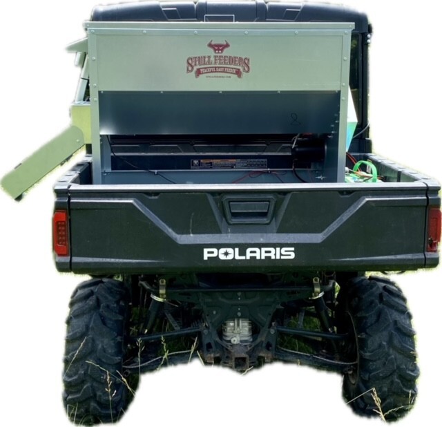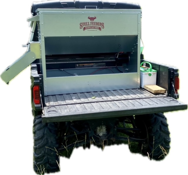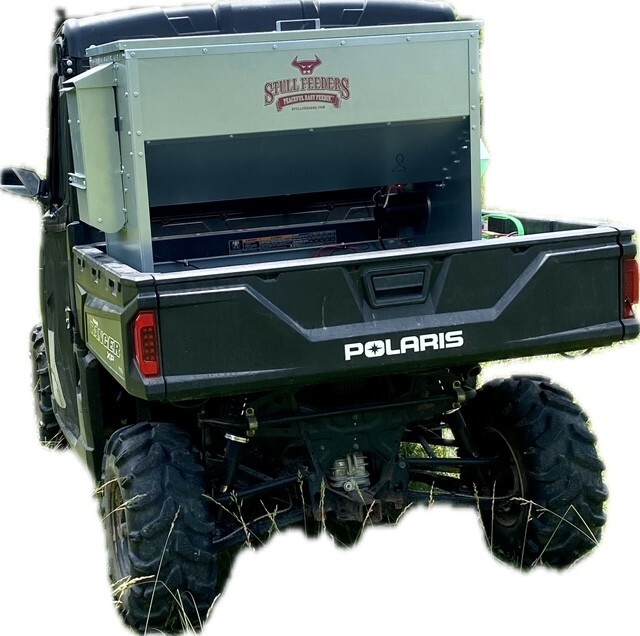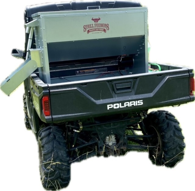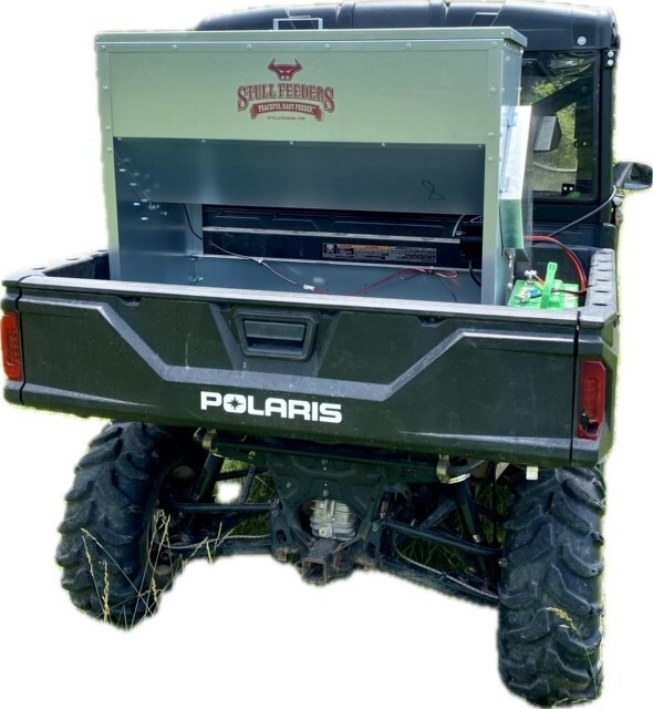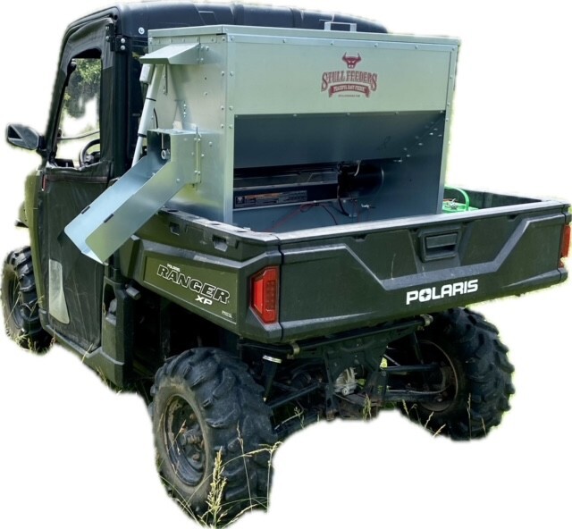 This feeder sits down inside the bed of a UTV. It is made of 16 GA Galvanized Steel and has a 4 inch chain driven auger. There is an actuator to control the chute up and down from the cab without getting out. It has a 12 volt motor with an "on demand" style switch with toggles to control actuator and motor for easy control from your seat that works off of a Deep Cycle auxiliary battery (NOT INCLUDED) (DO NOT ATTACH TO YOUR UTV BATTERY UNTIL YOU TALK TO YOUR UTV MECHANIC. MOTOR DRAWS 30 AMPS) The auger cover inside of the feeder adjusts for different Grain or Cube types. This feeder has a capacity of holding up to 300 pounds of whole corn. It is a great feeder to feed all types of livestock including bait piles for wildlife. This unit is made to bolt to bottom of UTV bed. If mounted on load cells for a scale you must use extra metal between load cell and bottom ends of feeder for reinforcement. We offer a bracket for this. Feeder Dimensions 21D x 43W x 36T. EMPTY FEEDER WEIGHT IS 185 LBS.