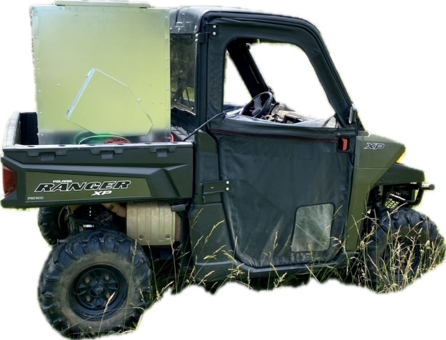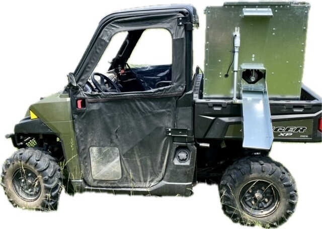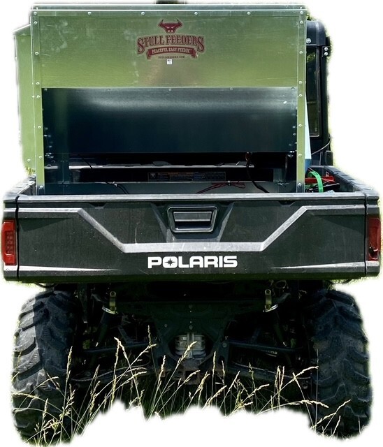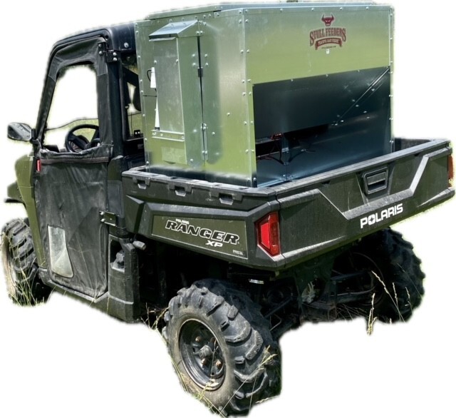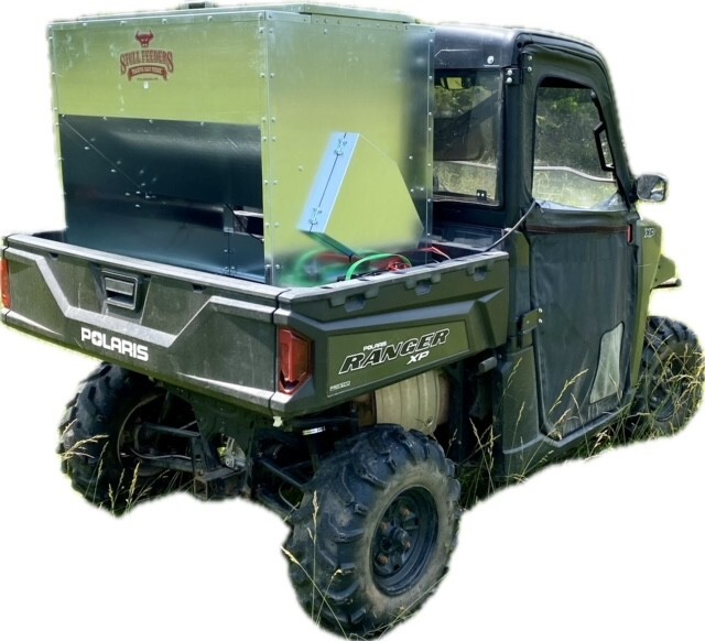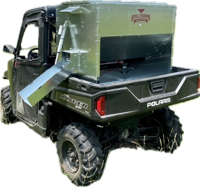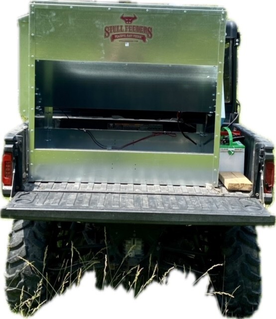This feeder sits down inside the bed of a UTV. It is made of 16 GA Galvanized Steel and has a 4 inch chain driven auger. There is an actuator to control the chute up and down from the cab without getting out. It has a 12 volt motor with a 20ft "on demand" style switch with toggles to control Actuator and Motor from your seat that works off of a Deep Cycle auxiliary battery (NOT INCLUDED) (DO NOT ATTACH TO YOUR UTV BATTERY UNTIL YOU TALK TO YOUR UTV MECHANIC. MOTOR DRAWS 30 AMPS) The auger cover inside of the feeder adjusts for different Grain or Cube types. This feeder has a capacity of holding up to 600 pounds of whole corn. It is a great feeder to feed all types of livestock including bait piles for wildlife. This unit is made to bolt to bottom of UTV bed. If mounted on load cells for a scale you must use extra metal between load cell and bottom ends of feeder for reinforcement. We offer a bracket for this. Feeder Dimensions 30D x 43W x 41T. EMPTY FEEDER WEIGHT IS 225 LBS.