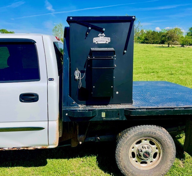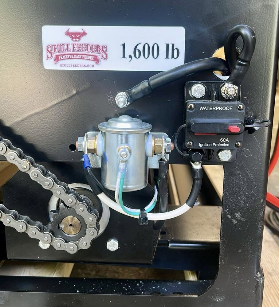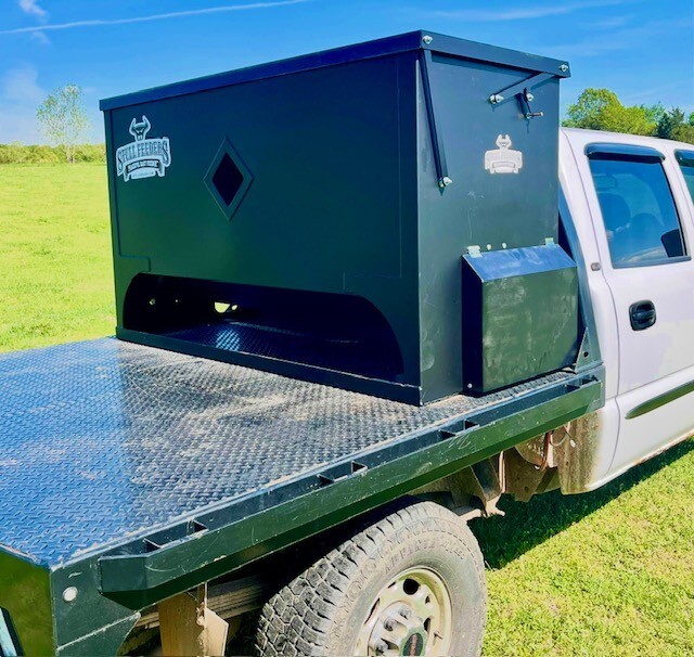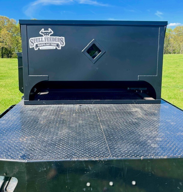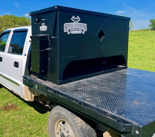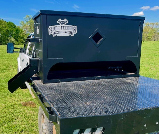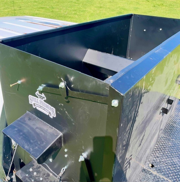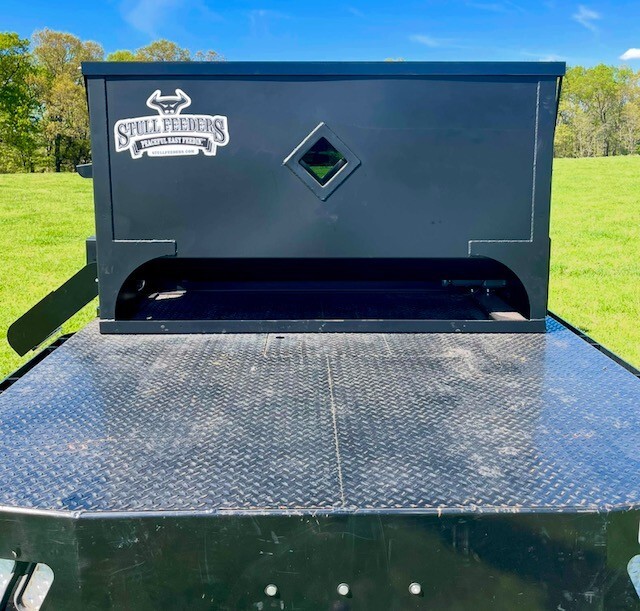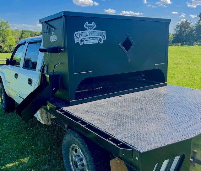 Our 1,600 lb Truck Feeder has a 6" Chain Driven Auger that turns a slow 60 RPM to help prevent crushing of Cake/Cubes. It is powered by a 12 volt High Torque motor that draws 45 amps with a Resettable Circuit Breaker. It has an on demand style switch that has a 20' long cord for easy control from your seat and also a 20' Bonded Power Cable. It is made of mostly 10ga steel that is Welded and Powder Coated Black with an easy open lid that is the full width of feeder. The Auger Cover inside of the feeder adjusts for the different Grain/Cube types. It has a 6 inch sight tube for rear visibility. This feeder is backed by a 1-year warranty. Must be greased every 50 hours of use for optimum performance. The dimensions are 70" wide X 31" deep X 42" tall and weighs 610 lbs empty.
