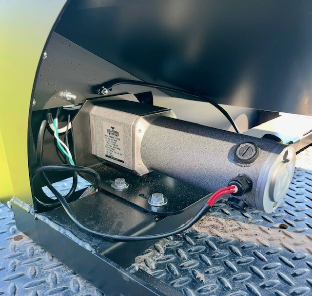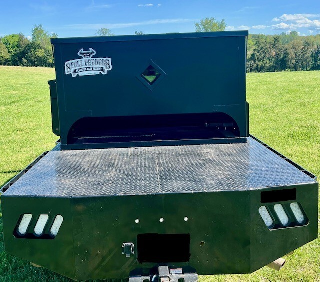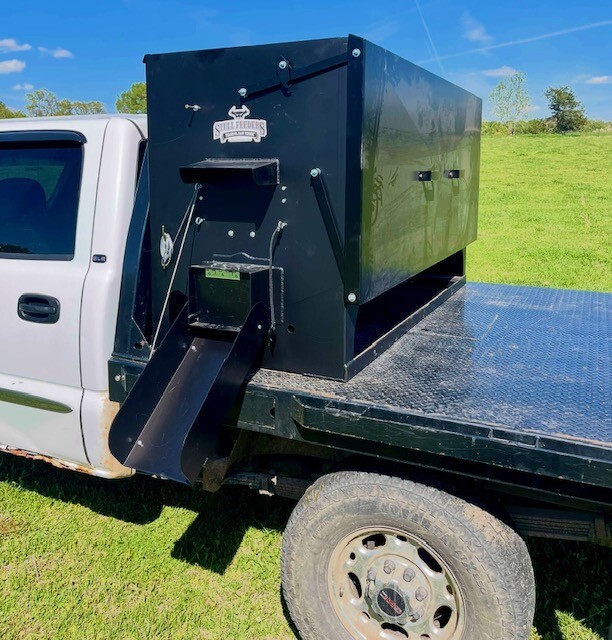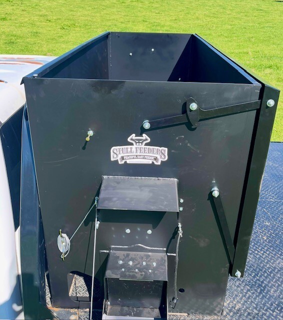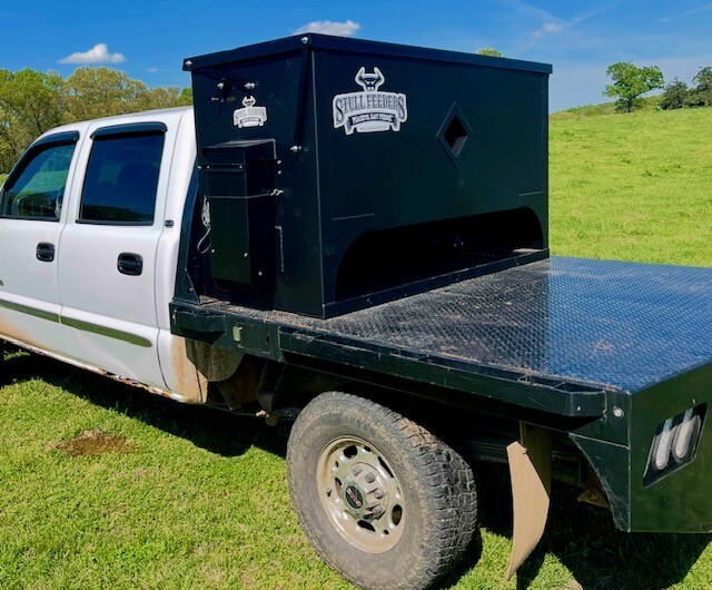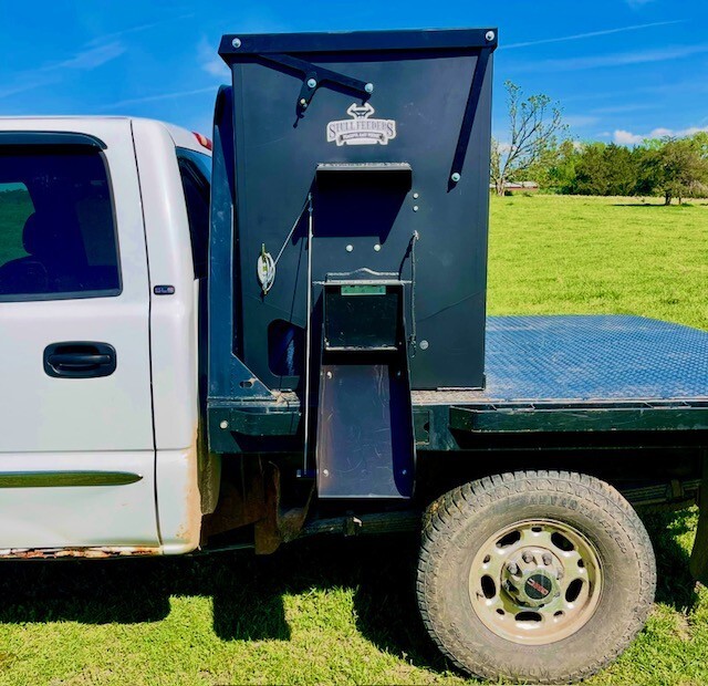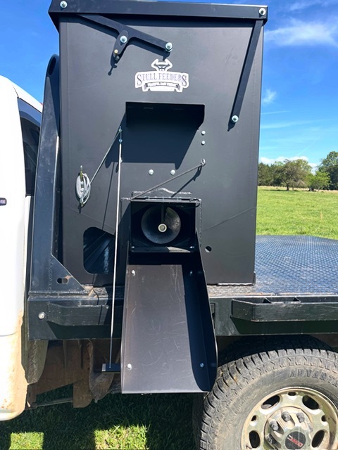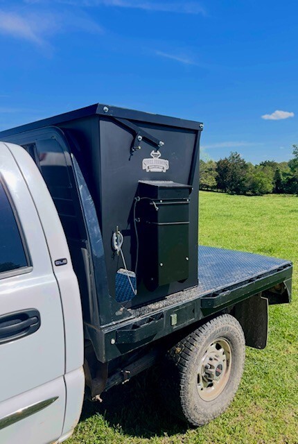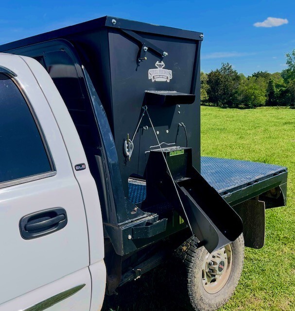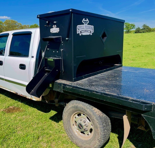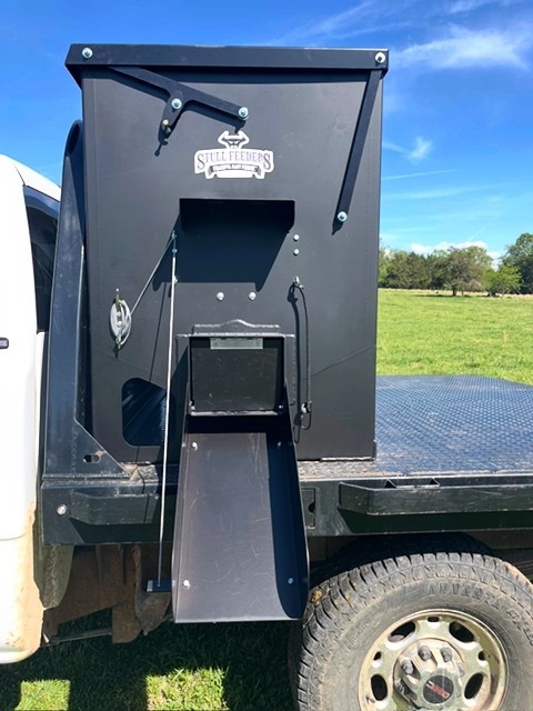 Our 1,600 lb Truck Feeder has a 6" Chain Driven Auger that turns a slow 60 RPM to help prevent crushing of Cake/Cubes. It is powered by a 12 volt High Torque motor that draws 45 amps with a Resettable Circuit Breaker. It has an on demand style switch that has a 20' long cord for easy control from your seat and also a 20' Bonded Power Cable. It is made of mostly 10ga steel that is Welded and Powder Coated Black with an easy open lid that is the full width of feeder. The Auger Cover inside of the feeder adjusts for the different Grain/Cube types. It has a 6 inch sight tube for rear visibility. This feeder is backed by a 1-year warranty. Must be greased every 50 hours of use for optimum performance. The dimensions are 70" wide X 31" deep X 42" tall and weighs 610 lbs empty.