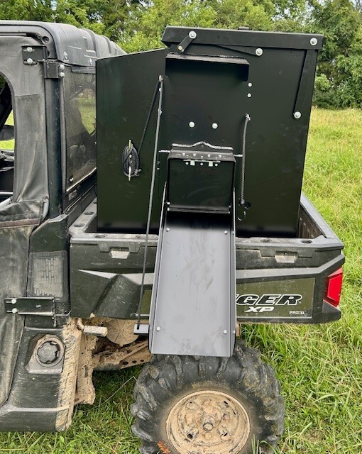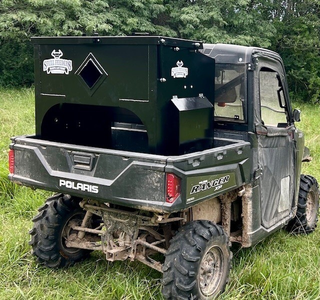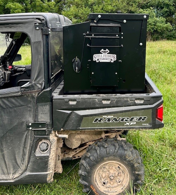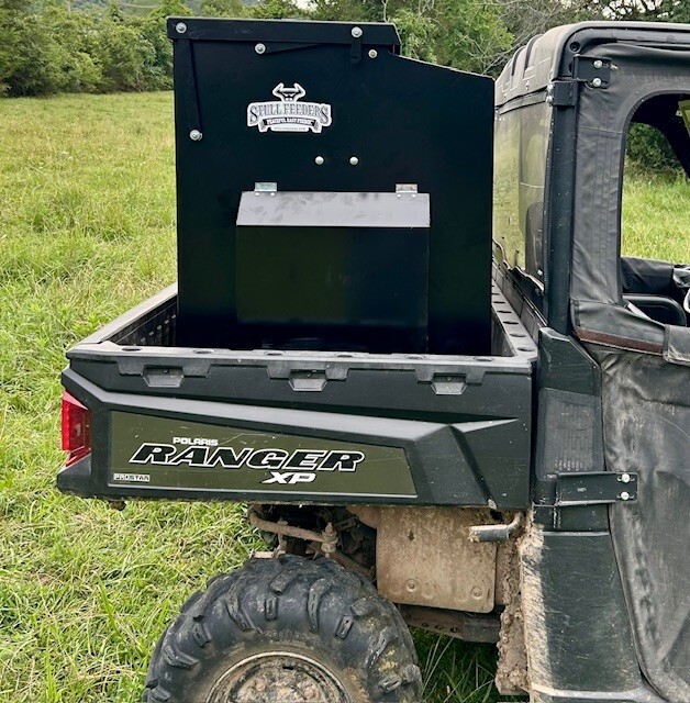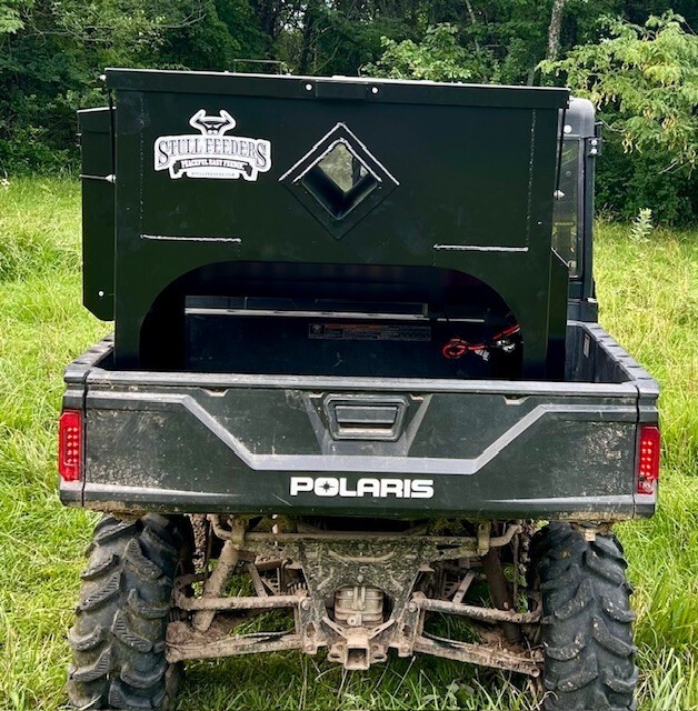 Our 700 lb UTV Feeder has a 6" Chain Driven Auger that turns a slow 60 RPM to help prevent crushing of Cake/Cubes. It is powered by a 12 volt High Torque motor that draws 45 amps with a Resettable Circuit Breaker. It has an on demand style switch that has a 20' long cord for easy control from your seat and also a 4' Bonded Power Cable for attaching to a 27M or 31M Marine Deep Cycle Auxiliary Battery. It is made of mostly 10ga steel that is Welded and Powder Coated Black with an easy open from the ground lid that is the full width of feeder. The Auger Cover inside of the feeder adjusts for the different Grain/Cube types. It has a 6 inch sight tube for rear visibility. This feeder is backed by a 1-year warranty. Must be greased every 50 hours of use for optimum performance. The dimensions are 44" wide X 31" deep X 43" tall and weighs 500 lbs empty.